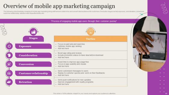 The following slide illustrates meaning of mobile app marketing along with funnel to determine and convert ideal audience into customers. It includes stages namely exposure, consideration, conversion, customer relationship, retention with respective tactics etc. The Leveraging Mobile Marketing Strategies Overview Of Mobile App Marketing Campaign Template Pdf is a compilation of the most recent design trends as a series of slides. It is suitable for any subject or industry presentation, containing attractive visuals and photo spots for businesses to clearly express their messages. This template contains a variety of slides for the user to input data, such as structures to contrast two elements, bullet points, and slides for written information. Slidegeeks is prepared to create an impression. The following slide illustrates meaning of mobile app marketing along with funnel to determine and convert ideal audience into customers. It includes stages namely exposure, consideration, conversion, customer relationship, retention with respective tactics etc.