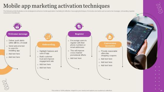 The following slide illustrates some strategies to enhance mobile application marketing for effective messaging techniques. It includes elements such as welcome message, onboarding, register, conversion incentive etc. Formulating a presentation can take up a lot of effort and time, so the content and message should always be the primary focus. The visuals of the PowerPoint can enhance the presenters message, so our Leveraging Mobile Marketing Strategies Mobile App Marketing Activation Techniques Download Pdf was created to help save time. Instead of worrying about the design, the presenter can concentrate on the message while our designers work on creating the ideal templates for whatever situation is needed. Slidegeeks has experts for everything from amazing designs to valuable content, we have put everything into Leveraging Mobile Marketing Strategies Mobile App Marketing Activation Techniques Download Pdf. The following slide illustrates some strategies to enhance mobile application marketing for effective messaging techniques. It includes elements such as welcome message, onboarding, register, conversion incentive etc.
