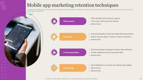 The following slide illustrates some mobile phone application promotional retention strategies to enhance customer lifetime values. It includes elements such as discounts, content, customization, updating etc. This modern and well-arranged Leveraging Mobile Marketing Strategies Mobile App Marketing Retention Techniques Guidelines Pdf provides lots of creative possibilities. It is very simple to customize and edit with the Powerpoint Software. Just drag and drop your pictures into the shapes. All facets of this template can be edited with Powerpoint no extra software is necessary. Add your own material, put your images in the places assigned for them, adjust the colors, and then you can show your slides to the world, with an animated slide included. The following slide illustrates some mobile phone application promotional retention strategies to enhance customer lifetime values. It includes elements such as discounts, content, customization, updating etc.