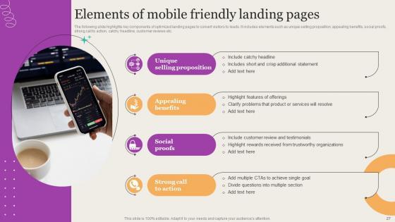 The following slide highlights key components of optimized landing pages to convert visitors to leads. It includes elements such as unique selling proposition, appealing benefits, social proofs, strong call to action, catchy headline, customer reviews etc. Present like a pro with Leveraging Mobile Marketing Strategies Elements Of Mobile Friendly Landing Pages Portrait Pdf Create beautiful presentations together with your team, using our easy-to-use presentation slides. Share your ideas in real-time and make changes on the fly by downloading our templates. So whether you are in the office, on the go, or in a remote location, you can stay in sync with your team and present your ideas with confidence. With Slidegeeks presentation got a whole lot easier. Grab these presentations today. The following slide highlights key components of optimized landing pages to convert visitors to leads. It includes elements such as unique selling proposition, appealing benefits, social proofs, strong call to action, catchy headline, customer reviews etc.