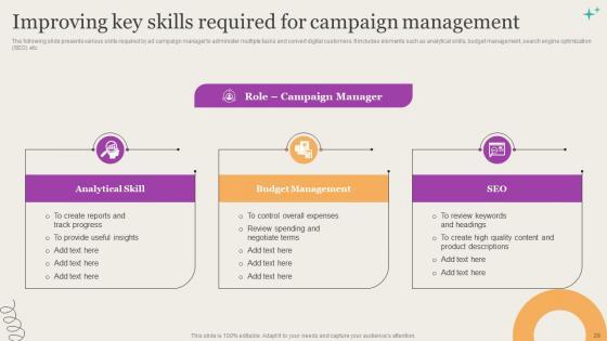 The following slide presents various skills required by ad campaign manager to administer multiple tasks and convert digital customers. It includes elements such as analytical skills, budget management, search engine optimization SEO etc. Do you have an important presentation coming up Are you looking for something that will make your presentation stand out from the rest Look no further than Leveraging Mobile Marketing Strategies Improving Key Skills Required For Campaign Ideas Pdf. With our professional designs, you can trust that your presentation will pop and make delivering it a smooth process. And with Slidegeeks, you can trust that your presentation will be unique and memorable. So why wait Grab Leveraging Mobile Marketing Strategies Improving Key Skills Required For Campaign Ideas Pdf today and make your presentation stand out from the rest. The following slide presents various skills required by ad campaign manager to administer multiple tasks and convert digital customers. It includes elements such as analytical skills, budget management, search engine optimization SEO etc.