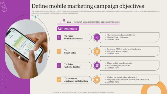The following slide depicts the key goals of mobile marketing campaign to plan launch actions and achieve the desired results. It includes elements such as raise brand awareness, boost sales, drive more website traffic, increase customer satisfaction etc. There are so many reasons you need a Leveraging Mobile Marketing Strategies Define Mobile Marketing Campaign Objectives Guidelines Pdf. The first reason is you can not spend time making everything from scratch, Thus, Slidegeeks has made presentation templates for you too. You can easily download these templates from our website easily. The following slide depicts the key goals of mobile marketing campaign to plan launch actions and achieve the desired results. It includes elements such as raise brand awareness, boost sales, drive more website traffic, increase customer satisfaction etc.