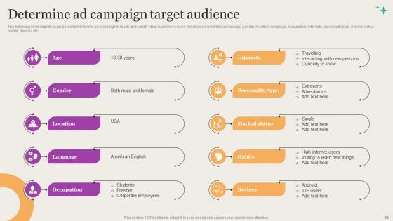 The following slide depicts buyer persona for mobile ad campaign to reach and satisfy ideal customers need. It includes elements such as age, gender, location, language, occupation, interests, personality type, marital status, habits, devices etc. Do you have to make sure that everyone on your team knows about any specific topic I yes, then you should give Leveraging Mobile Marketing Strategies Determine Ad Campaign Target Audience Sample Pdf a try. Our experts have put a lot of knowledge and effort into creating this impeccable Leveraging Mobile Marketing Strategies Determine Ad Campaign Target Audience Sample Pdf. You can use this template for your upcoming presentations, as the slides are perfect to represent even the tiniest detail. You can download these templates from the Slidegeeks website and these are easy to edit. So grab these today. The following slide depicts buyer persona for mobile ad campaign to reach and satisfy ideal customers need. It includes elements such as age, gender, location, language, occupation, interests, personality type, marital status, habits, devices etc.