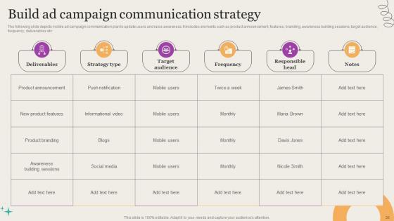 The following slide depicts mobile ad campaign communication plan to update users and raise awareness. It includes elements such as product announcement, features, branding, awareness building sessions, target audience, frequency, deliverables etc. Slidegeeks is one of the best resources for PowerPoint templates. You can download easily and regulate Leveraging Mobile Marketing Strategies Build Ad Campaign Communication Strategy Sample Pdf for your personal presentations from our wonderful collection. A few clicks is all it takes to discover and get the most relevant and appropriate templates. Use our Templates to add a unique zing and appeal to your presentation and meetings. All the slides are easy to edit and you can use them even for advertisement purposes. The following slide depicts mobile ad campaign communication plan to update users and raise awareness. It includes elements such as product announcement, features, branding, awareness building sessions, target audience, frequency, deliverables etc.