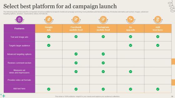 The following slide showcases the comparison of various platforms to launch mobile ad campaign and bring more potential customers to business. It includes elements such as text, images, advanced targeting options, ad views, impressions, videos, formats etc. Slidegeeks is one of the best resources for PowerPoint templates. You can download easily and regulate Leveraging Mobile Marketing Strategies Select Best Platform For Ad Campaign Launch Graphics Pdf for your personal presentations from our wonderful collection. A few clicks is all it takes to discover and get the most relevant and appropriate templates. Use our Templates to add a unique zing and appeal to your presentation and meetings. All the slides are easy to edit and you can use them even for advertisement purposes. The following slide showcases the comparison of various platforms to launch mobile ad campaign and bring more potential customers to business. It includes elements such as text, images, advanced targeting options, ad views, impressions, videos, formats etc.
