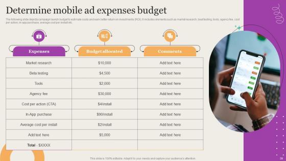 The following slide depicts campaign launch budget to estimate costs and earn better return on investments ROI. It includes elements such as market research, beat testing, tools, agency fee, cost per action, in-app purchase, average cost per install etc. Get a simple yet stunning designed Leveraging Mobile Marketing Strategies Determine Mobile Ad Expenses Budget Designs Pdf. It is the best one to establish the tone in your meetings. It is an excellent way to make your presentations highly effective. So, download this PPT today from Slidegeeks and see the positive impacts. Our easy-to-edit Leveraging Mobile Marketing Strategies Determine Mobile Ad Expenses Budget Designs Pdf can be your go-to option for all upcoming conferences and meetings. So, what are you waiting for Grab this template today. The following slide depicts campaign launch budget to estimate costs and earn better return on investments ROI. It includes elements such as market research, beat testing, tools, agency fee, cost per action, in-app purchase, average cost per install etc.
