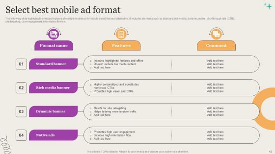 The following slide highlights the various features of multiple mobile ad formats to select the best alternative. It includes elements such as standard, rich media, dynamic, native, click through rate CTR, site targeting, user engagement, information flow etc. Create an editable Select Best Mobile Ad Format Leveraging Mobile Marketing Strategies Themes Pdf that communicates your idea and engages your audience. Whether you are presenting a business or an educational presentation, pre designed presentation templates help save time. Select Best Mobile Ad Format Leveraging Mobile Marketing Strategies Themes Pdf is highly customizable and very easy to edit, covering many different styles from creative to business presentations. Slidegeeks has creative team members who have crafted amazing templates. So, go and get them without any delay. The following slide highlights the various features of multiple mobile ad formats to select the best alternative. It includes elements such as standard, rich media, dynamic, native, click through rate CTR, site targeting, user engagement, information flow etc.