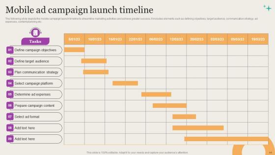 The following slide depicts the mobile campaign launch timeline to streamline marketing activities and achieve greater success. It includes elements such as defining objectives, target audience, communication strategy, ad expenses, content planning etc. Crafting an eye-catching presentation has never been more straightforward. Let your presentation shine with this tasteful yet straightforward Leveraging Mobile Marketing Strategies Mobile Ad Campaign Launch Timeline Template Pdf template. It offers a minimalistic and classy look that is great for making a statement. The colors have been employed intelligently to add a bit of playfulness while still remaining professional. Construct the ideal Leveraging Mobile Marketing Strategies Mobile Ad Campaign Launch Timeline Template Pdf that effortlessly grabs the attention of your audience. Begin now and be certain to wow your customers. The following slide depicts the mobile campaign launch timeline to streamline marketing activities and achieve greater success. It includes elements such as defining objectives, target audience, communication strategy, ad expenses, content planning etc.