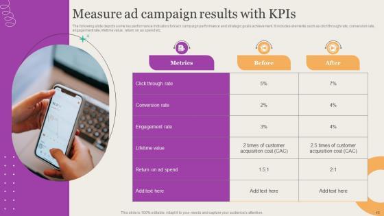 The following slide depicts some key performance indicators to track campaign performance and strategic goals achievement. It includes elements such as click through rate, conversion rate, engagement rate, lifetime value, return on as spend etc. If you are looking for a format to display your unique thoughts, then the professionally designed Leveraging Mobile Marketing Strategies Measure Ad Campaign Results With Kpis Topics Pdf is the one for you. You can use it as a Google Slides template or a PowerPoint template. Incorporate impressive visuals, symbols, images, and other charts. Modify or reorganize the text boxes as you desire. Experiment with shade schemes and font pairings. Alter, share or cooperate with other people on your work. Download Leveraging Mobile Marketing Strategies Measure Ad Campaign Results With Kpis Topics Pdf and find out how to give a successful presentation. Present a perfect display to your team and make your presentation unforgettable. The following slide depicts some key performance indicators to track campaign performance and strategic goals achievement. It includes elements such as click through rate, conversion rate, engagement rate, lifetime value, return on as spend etc.