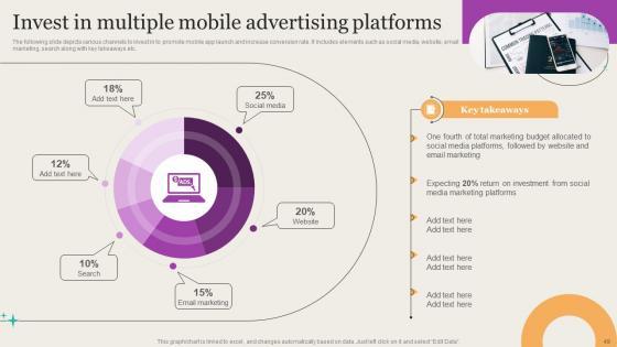 The following slide depicts various channels to invest in to promote mobile app launch and increase conversion rate. It includes elements such as social media, website, email marketing, search along with key takeaways etc. Whether you have daily or monthly meetings, a brilliant presentation is necessary. Leveraging Mobile Marketing Strategies Invest In Multiple Mobile Advertising Platforms Sample Pdf can be your best option for delivering a presentation. Represent everything in detail using Leveraging Mobile Marketing Strategies Invest In Multiple Mobile Advertising Platforms Sample Pdf and make yourself stand out in meetings. The template is versatile and follows a structure that will cater to your requirements. All the templates prepared by Slidegeeks are easy to download and edit. Our research experts have taken care of the corporate themes as well. So, give it a try and see the results. The following slide depicts various channels to invest in to promote mobile app launch and increase conversion rate. It includes elements such as social media, website, email marketing, search along with key takeaways etc.