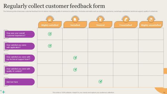 The following slide showcases customer feedback form to deliver improved quality of services to customers. It includes elements such as customer experience, overall app satisfaction, technical support, quality of content etc. Take your projects to the next level with our ultimate collection of Leveraging Mobile Marketing Strategies Regularly Collect Customer Feedback Form Portrait Pdf. Slidegeeks has designed a range of layouts that are perfect for representing task or activity duration, keeping track of all your deadlines at a glance. Tailor these designs to your exact needs and give them a truly corporate look with your own brand colors they well make your projects stand out from the rest. The following slide showcases customer feedback form to deliver improved quality of services to customers. It includes elements such as customer experience, overall app satisfaction, technical support, quality of content etc.