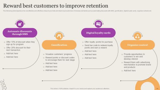 The following slide depicts some cost effective and effortless ideas to promote and retain loyal customers. It includes elements such as automating discounts with SMS, gamification, digital loyalty cards, organize contests etc. Do you know about Slidesgeeks Leveraging Mobile Marketing Strategies Reward Best Customers To Improve Retention Mockup Pdf These are perfect for delivering any kind od presentation. Using it, create PowerPoint presentations that communicate your ideas and engage audiences. Save time and effort by using our pre-designed presentation templates that are perfect for a wide range of topic. Our vast selection of designs covers a range of styles, from creative to business, and are all highly customizable and easy to edit. Download as a PowerPoint template or use them as Google Slides themes. The following slide depicts some cost effective and effortless ideas to promote and retain loyal customers. It includes elements such as automating discounts with SMS, gamification, digital loyalty cards, organize contests etc.