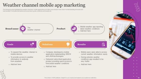 The following slide highlights the weather channels mobile application promotion case study to have clear i understanding of issues and real benefits. It includes elements such as product, goals, solutions and results etc. Do you have an important presentation coming up Are you looking for something that will make your presentation stand out from the rest Look no further than Weather Channel Mobile App Leveraging Mobile Marketing Strategies Summary Pdf. With our professional designs, you can trust that your presentation will pop and make delivering it a smooth process. And with Slidegeeks, you can trust that your presentation will be unique and memorable. So why wait Grab Weather Channel Mobile App Leveraging Mobile Marketing Strategies Summary Pdf today and make your presentation stand out from the rest. The following slide highlights the weather channels mobile application promotion case study to have clear i understanding of issues and real benefits. It includes elements such as product, goals, solutions and results etc.
