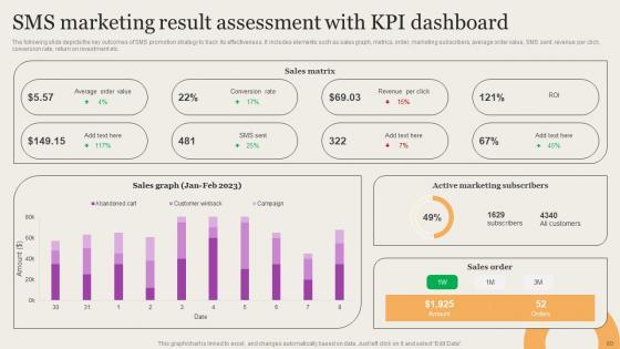 The following slide depicts the key outcomes of SMS promotion strategy to track its effectiveness. It includes elements such as sales graph, metrics, order, marketing subscribers, average order value, SMS sent, revenue per click, conversion rate, return on investment etc. Do you have to make sure that everyone on your team knows about any specific topic I yes, then you should give SMS Marketing Result Assessment Leveraging Mobile Marketing Strategies Topics Pdf a try. Our experts have put a lot of knowledge and effort into creating this impeccable SMS Marketing Result Assessment Leveraging Mobile Marketing Strategies Topics Pdf. You can use this template for your upcoming presentations, as the slides are perfect to represent even the tiniest detail. You can download these templates from the Slidegeeks website and these are easy to edit. So grab these today. The following slide depicts the key outcomes of SMS promotion strategy to track its effectiveness. It includes elements such as sales graph, metrics, order, marketing subscribers, average order value, SMS sent, revenue per click, conversion rate, return on investment etc.