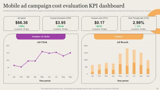 The following slide depicts mobile advertisement campaign cost assessment to measure its impact and returns. It includes elements such as ad spend, cost per thousand, cost per click, click through rate, ad reach, clicks etc. Are you in need of a template that can accommodate all of your creative concepts This one is crafted professionally and can be altered to fit any style. Use it with Google Slides or PowerPoint. Include striking photographs, symbols, depictions, and other visuals. Fill, move around, or remove text boxes as desired. Test out color palettes and font mixtures. Edit and save your work, or work with colleagues. Download Leveraging Mobile Marketing Strategies Mobile Ad Campaign Cost Evaluation Kpi Sample Pdf and observe how to make your presentation outstanding. Give an impeccable presentation to your group and make your presentation unforgettable. The following slide depicts mobile advertisement campaign cost assessment to measure its impact and returns. It includes elements such as ad spend, cost per thousand, cost per click, click through rate, ad reach, clicks etc.