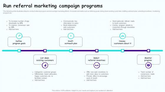 The following slide illustrates steps to conduct referral program and encourage marketing efforts. It includes elements such as defining goals, listing down existing customers, drafting outreach plan, selecting incentives, monitoring program etc. Find a pre-designed and impeccable Leveraging Mobile Marketing Strategies Run Referral Marketing Campaign Programs Summary Pdf. The templates can ace your presentation without additional effort. You can download these easy-to-edit presentation templates to make your presentation stand out from others. So, what are you waiting for Download the template from Slidegeeks today and give a unique touch to your presentation. The following slide illustrates steps to conduct referral program and encourage marketing efforts. It includes elements such as defining goals, listing down existing customers, drafting outreach plan, selecting incentives, monitoring program etc.