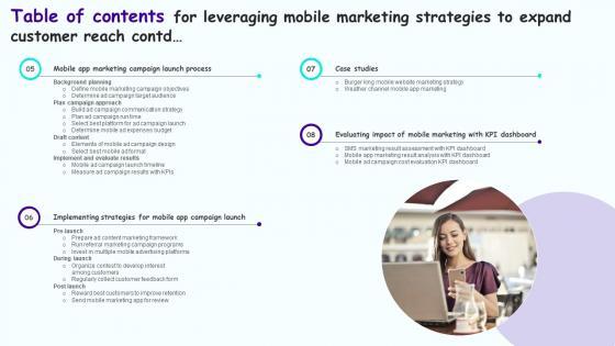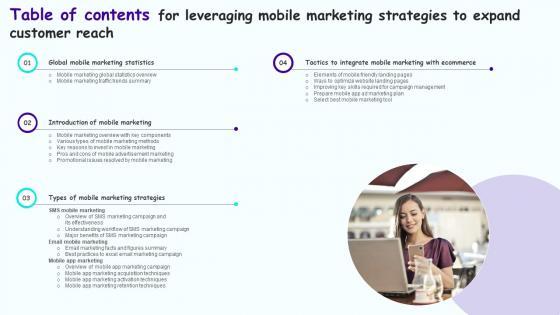 Get a simple yet stunning designed Table Of Contents For Leveraging Mobile Marketing Strategies To Expand Pictures Pdf. It is the best one to establish the tone in your meetings. It is an excellent way to make your presentations highly effective. So, download this PPT today from Slidegeeks and see the positive impacts. Our easy to edit Table Of Contents For Leveraging Mobile Marketing Strategies To Expand Pictures Pdf can be your go to option for all upcoming conferences and meetings. So, what are you waiting for Grab this template today. Our Table Of Contents For Leveraging Mobile Marketing Strategies To Expand Pictures Pdf are topically designed to provide an attractive backdrop to any subject. Use them to look like a presentation pro.