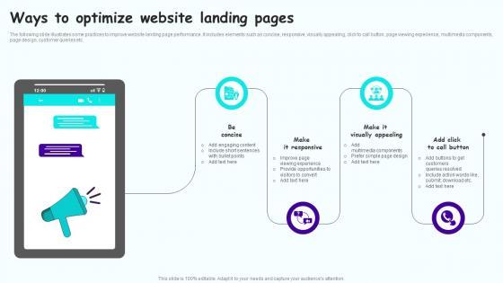 The following slide illustrates some practices to improve website landing page performance. It includes elements such as concise, responsive, visually appealing, click to call button, page viewing experience, multimedia components, page design, customer queries etc. Slidegeeks is here to make your presentations a breeze with Ways To Optimize Website Leveraging Mobile Marketing Strategies Template Pdf With our easy to use and customizable templates, you can focus on delivering your ideas rather than worrying about formatting. With a variety of designs to choose from, you are sure to find one that suits your needs. And with animations and unique photos, illustrations, and fonts, you can make your presentation pop. So whether you are giving a sales pitch or presenting to the board, make sure to check out Slidegeeks first. The following slide illustrates some practices to improve website landing page performance. It includes elements such as concise, responsive, visually appealing, click to call button, page viewing experience, multimedia components, page design, customer queries etc.