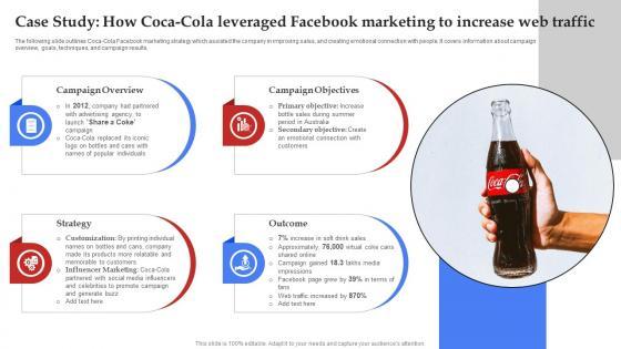 The following slide outlines Coca-Cola Facebook marketing strategy which assisted the company in improving sales, and creating emotional connection with people. It covers information about campaign overview, goals, techniques, and campaign results. Slidegeeks is here to make your presentations a breeze with Facebook Marketing Plan Case Study How Coca Cola Leveraged Facebook Strategy SS V With our easy-to-use and customizable templates, you can focus on delivering your ideas rather than worrying about formatting. With a variety of designs to choose from, you are sure to find one that suits your needs. And with animations and unique photos, illustrations, and fonts, you can make your presentation pop. So whether you are giving a sales pitch or presenting to the board, make sure to check out Slidegeeks first The following slide outlines Coca-Cola Facebook marketing strategy which assisted the company in improving sales, and creating emotional connection with people. It covers information about campaign overview, goals, techniques, and campaign results.