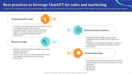 This slide showcases best practices that can help organization to utilize ChatGPT for sales and marketing. Its key components are training ChatGPT model, maintain brand consistency, human oversight and continuous learning. Slidegeeks is one of the best resources for PowerPoint templates. You can download easily and regulate ChatGpt Comprehensive Guide Best Practices To Leverage ChatGpt Ppt Powerpoint ChatGpt SS V for your personal presentations from our wonderful collection. A few clicks is all it takes to discover and get the most relevant and appropriate templates. Use our Templates to add a unique zing and appeal to your presentation and meetings. All the slides are easy to edit and you can use them even for advertisement purposes. This slide showcases best practices that can help organization to utilize ChatGPT for sales and marketing. Its key components are training ChatGPT model, maintain brand consistency, human oversight and continuous learning.