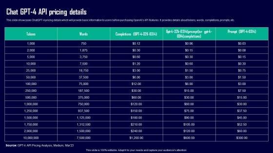 This slide showcases ChatGPT-4 pricing details which will provide basic information to users before purchasing OpenAIs API features. It provides details about tokens, words, completions, prompts, etc. Find a pre designed and impeccable Leveraging Openai API For Business Chat Gpt 4 API Pricing Details Ideas PDF. The templates can ace your presentation without additional effort. You can download these easy to edit presentation templates to make your presentation stand out from others. So, what are you waiting for Download the template from Slidegeeks today and give a unique touch to your presentation.