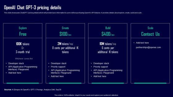 This slide showcases ChatGPT 3 pricing details which will provide basic information to users before purchasing OpenAIs API features. It provides details about explore, create, build and scale. Slidegeeks is one of the best resources for PowerPoint templates. You can download easily and regulate Leveraging Openai API For Business Openai Chat GPT 3 Pricing Details Icons PDF for your personal presentations from our wonderful collection. A few clicks is all it takes to discover and get the most relevant and appropriate templates. Use our Templates to add a unique zing and appeal to your presentation and meetings. All the slides are easy to edit and you can use them even for advertisement purposes.