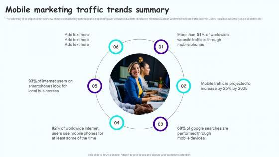 The following slide depicts brief overview of mobile marketing traffic to plan ad spending over web based outlets. It includes elements such as worldwide website traffic, internet users, local businesses, google searches etc. Explore a selection of the finest Leveraging Mobile Marketing Strategies Mobile Marketing Traffic Trends Summary Diagrams Pdf here. With a plethora of professionally designed and pre-made slide templates, you can quickly and easily find the right one for your upcoming presentation. You can use our Leveraging Mobile Marketing Strategies Mobile Marketing Traffic Trends Summary Diagrams Pdf to effectively convey your message to a wider audience. Slidegeeks has done a lot of research before preparing these presentation templates. The content can be personalized and the slides are highly editable. Grab templates today from Slidegeeks. The following slide depicts brief overview of mobile marketing traffic to plan ad spending over web based outlets. It includes elements such as worldwide website traffic, internet users, local businesses, google searches etc.