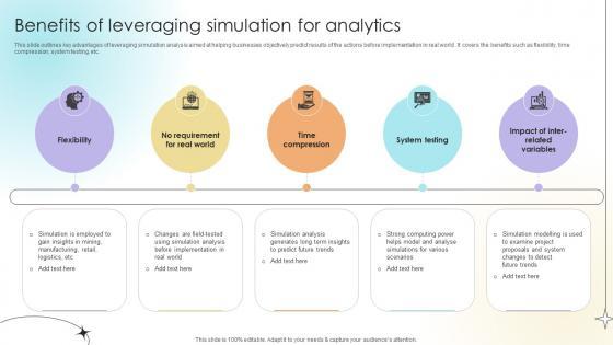 This slide outlines key advantages of leveraging simulation analysis aimed at helping businesses objectively predict results of the actions before implementation in real world . It covers the benefits such as flexibility, time compression, system testing, etc. This modern and well-arranged Benefits Of Leveraging Simulation For Analytics Data Analytics SS V provides lots of creative possibilities. It is very simple to customize and edit with the Powerpoint Software. Just drag and drop your pictures into the shapes. All facets of this template can be edited with Powerpoint, no extra software is necessary. Add your own material, put your images in the places assigned for them, adjust the colors, and then you can show your slides to the world, with an animated slide included. This slide outlines key advantages of leveraging simulation analysis aimed at helping businesses objectively predict results of the actions before implementation in real world . It covers the benefits such as flexibility, time compression, system testing, etc.