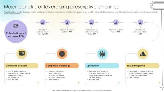 This slide outlines benefits of using prescriptive analytics aimed at helping businesses to meet its long term goals. It covers benefits such as data driven decisions, competitive advantage, optimization and risk management with potential impact on KPIs.Are you in need of a template that can accommodate all of your creative concepts This one is crafted professionally and can be altered to fit any style. Use it with Google Slides or PowerPoint. Include striking photographs, symbols, depictions, and other visuals. Fill, move around, or remove text boxes as desired. Test out color palettes and font mixtures. Edit and save your work, or work with colleagues. Download Major Benefits Of Leveraging Prescriptive Analytics Data Analytics SS V and observe how to make your presentation outstanding. Give an impeccable presentation to your group and make your presentation unforgettable. This slide outlines benefits of using prescriptive analytics aimed at helping businesses to meet its long term goals. It covers benefits such as data driven decisions, competitive advantage, optimization and risk management with potential impact on KPIs.