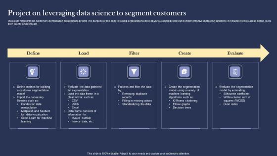 This slide highlights the customer segmentation data science project. The purpose of this slide is to help organizations develop various client profiles and employ effective marketing initiatives. It includes steps such as define, load, filter, create and evaluate. Pitch your topic with ease and precision using this Project On Leveraging Data Science To Segment Customers Summary pdf. This layout presents information on Define, Load, Filter, Create, Evaluate. It is also available for immediate download and adjustment. So, changes can be made in the color, design, graphics or any other component to create a unique layout. This slide highlights the customer segmentation data science project. The purpose of this slide is to help organizations develop various client profiles and employ effective marketing initiatives. It includes steps such as define, load, filter, create and evaluate.
