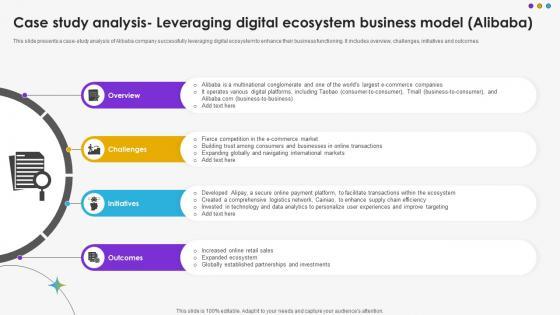 This slide presents a case-study analysis of Alibaba company successfully leveraging digital ecosystem to enhance their business functioning. It includes overview, challenges, initiatives and outcomes.If your project calls for a presentation, then Slidegeeks is your go-to partner because we have professionally designed, easy-to-edit templates that are perfect for any presentation. After downloading, you can easily edit Case Study Analysis Leveraging Digital Ecosystem Business Model Alibaba DT SS V and make the changes accordingly. You can rearrange slides or fill them with different images. Check out all the handy templates This slide presents a case-study analysis of Alibaba company successfully leveraging digital ecosystem to enhance their business functioning. It includes overview, challenges, initiatives and outcomes.