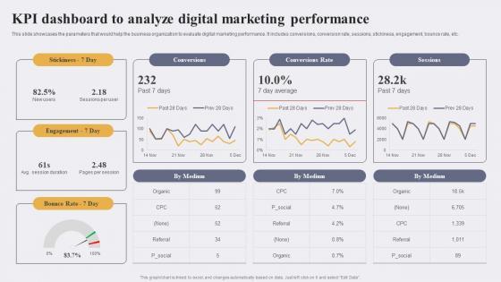 This slide showcases the parameters that would help the business organization to evaluate digital marketing performance. It includes conversions, conversion rate, sessions, stickiness, engagement, bounce rate, etc.If you are looking for a format to display your unique thoughts, then the professionally designed KPI Dashboard To Analyze Digital Marketing Enhancing Conversion Rate By Leveraging Background Pdf is the one for you. You can use it as a Google Slides template or a PowerPoint template. Incorporate impressive visuals, symbols, images, and other charts. Modify or reorganize the text boxes as you desire. Experiment with shade schemes and font pairings. Alter, share or cooperate with other people on your work. Download KPI Dashboard To Analyze Digital Marketing Enhancing Conversion Rate By Leveraging Background Pdf and find out how to give a successful presentation. Present a perfect display to your team and make your presentation unforgettable. This slide showcases the parameters that would help the business organization to evaluate digital marketing performance. It includes conversions, conversion rate, sessions, stickiness, engagement, bounce rate, etc.