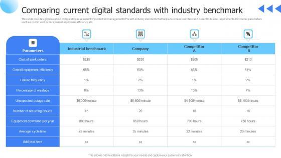 This slide provides glimpse about comparative assessment of production management KPIs with industry standards that help a business to understand current industrial requirements. It includes parameters such as cost of work orders, overall equipment efficiency, etc. There are so many reasons you need a Leveraging Advanced Manufacturing Comparing Current Digital Standards With Download Pdf The first reason is you can not spend time making everything from scratch, Thus, Slidegeeks has made presentation templates for you too. You can easily download these templates from our website easily. This slide provides glimpse about comparative assessment of production management KPIs with industry standards that help a business to understand current industrial requirements. It includes parameters such as cost of work orders, overall equipment efficiency, etc.