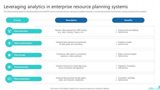 This slide presents strategies for integrating analytics tools with ERP systems to enhance decision-making and competitive advantage. It includes data extraction, transformation, storage, processing and visualization.Are you in need of a template that can accommodate all of your creative concepts This one is crafted professionally and can be altered to fit any style. Use it with Google Slides or PowerPoint. Include striking photographs, symbols, depictions, and other visuals. Fill, move around, or remove text boxes as desired. Test out color palettes and font mixtures. Edit and save your work, or work with colleagues. Download Leveraging Analytics In Enterprise Resource Planning Erp And Digital Transformation For Maximizing DT SS V and observe how to make your presentation outstanding. Give an impeccable presentation to your group and make your presentation unforgettable. This slide presents strategies for integrating analytics tools with ERP systems to enhance decision-making and competitive advantage. It includes data extraction, transformation, storage, processing and visualization.