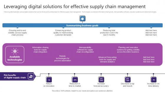 Following slide illustrates various digital solutions that can be introduced by enterprises for effective supply chain management. Technologies covered are information sharing tools, interoperability software, execution systems and robotic technologies. This Leveraging Digital Solutions For Effective Supply Chain Management Microsoft PDF from Slidegeeks makes it easy to present information on your topic with precision. It provides customization options, so you can make changes to the colors, design, graphics, or any other component to create a unique layout. It is also available for immediate download, so you can begin using it right away. Slidegeeks has done good research to ensure that you have everything you need to make your presentation stand out. Make a name out there for a brilliant performance.