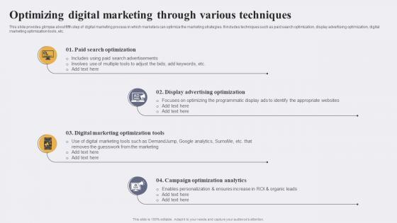 This slide provides glimpse about fifth step of digital marketing process in which marketers can optimize the marketing strategies. It includes techniques such as paid search optimization, display advertising optimization, digital marketing optimization tools, etc.This modern and well-arranged Optimizing Digital Marketing Through Various Enhancing Conversion Rate By Leveraging Guidelines Pdf provides lots of creative possibilities. It is very simple to customize and edit with the Powerpoint Software. Just drag and drop your pictures into the shapes. All facets of this template can be edited with Powerpoint no extra software is necessary. Add your own material, put your images in the places assigned for them, adjust the colors, and then you can show your slides to the world, with an animated slide included. This slide provides glimpse about fifth step of digital marketing process in which marketers can optimize the marketing strategies. It includes techniques such as paid search optimization, display advertising optimization, digital marketing optimization tools, etc.