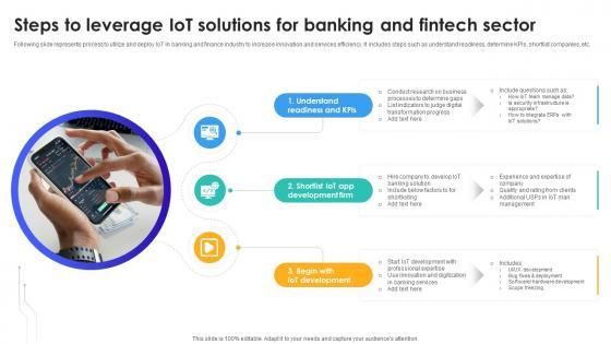 Following slide represents process to utilize and deploy IoT in banking and finance industry to increase innovation and services efficiency. It includes steps such as understand readiness, determine KPIs, shortlist companies, etc. Take your projects to the next level with our ultimate collection of Steps To Leverage IoT Solutions For Banking And Fintech IoT In Banking For Digital Future IoT SS V. Slidegeeks has designed a range of layouts that are perfect for representing task or activity duration, keeping track of all your deadlines at a glance. Tailor these designs to your exact needs and give them a truly corporate look with your own brand colors they will make your projects stand out from the rest Following slide represents process to utilize and deploy IoT in banking and finance industry to increase innovation and services efficiency. It includes steps such as understand readiness, determine KPIs, shortlist companies, etc.