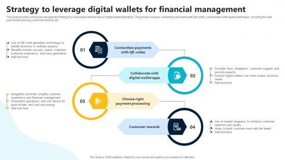 This slide provides a financial management strategy for businesses with the help of digital wallet integration. The process involves contactless payments with QR codes, collaboration with digital wallet apps, choosing the right payment processing, customer rewards, etc. This modern and well-arranged Strategy To Leverage Digital Wallets For Financial In Depth Guide To Digital Wallets Fin SS V provides lots of creative possibilities. It is very simple to customize and edit with the Powerpoint Software. Just drag and drop your pictures into the shapes. All facets of this template can be edited with Powerpoint, no extra software is necessary. Add your own material, put your images in the places assigned for them, adjust the colors, and then you can show your slides to the world, with an animated slide included. This slide provides a financial management strategy for businesses with the help of digital wallet integration. The process involves contactless payments with QR codes, collaboration with digital wallet apps, choosing the right payment processing, customer rewards, etc.