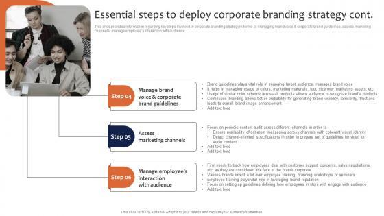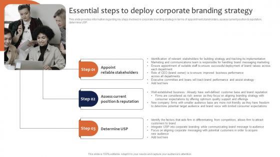 This slide provides information regarding key steps involved in corporate branding strategy in terms of appointment stakeholders, assess current position and reputation, determine USP. Coming up with a presentation necessitates that the majority of the effort goes into the content and the message you intend to convey. The visuals of a PowerPoint presentation can only be effective if it supplements and supports the story that is being told. Keeping this in mind our experts created Essential Steps To Deploy Corporate Branding Strategy Leveraging Corporate Infographics Pdf to reduce the time that goes into designing the presentation. This way, you can concentrate on the message while our designers take care of providing you with the right template for the situation. This slide provides information regarding key steps involved in corporate branding strategy in terms of appointment stakeholders, assess current position and reputation, determine USP.