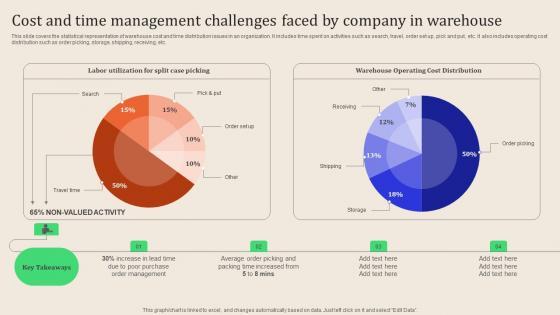 This slide covers the statistical representation of warehouse cost and time distribution issues in an organization. It includes time spent on activities such as search, travel, order set up, pick and put, etc. it also includes operating cost distribution such as order picking, storage, shipping, receiving, etc. From laying roadmaps to briefing everything in detail, our templates are perfect for you. You can set the stage with your presentation slides. All you have to do is download these easy to edit and customizable templates. Leveraging Logistics Automation Cost And Time Management Challenges Faced Template Pdf will help you deliver an outstanding performance that everyone would remember and praise you for. Do download this presentation today. This slide covers the statistical representation of warehouse cost and time distribution issues in an organization. It includes time spent on activities such as search, travel, order set up, pick and put, etc. it also includes operating cost distribution such as order picking, storage, shipping, receiving, etc.