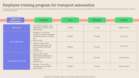 This slide covers the automatic truck driver training schedule. It includes training for different degrees of automation such as single sensor, sensor data fusion, sensor data fusion with map. It also includes cost, duration, and trainer for each level of training. Formulating a presentation can take up a lot of effort and time, so the content and message should always be the primary focus. The visuals of the PowerPoint can enhance the presenters message, so our Leveraging Logistics Automation Employee Training Program For Transport Diagrams Pdf was created to help save time. Instead of worrying about the design, the presenter can concentrate on the message while our designers work on creating the ideal templates for whatever situation is needed. Slidegeeks has experts for everything from amazing designs to valuable content, we have put everything into Leveraging Logistics Automation Employee Training Program For Transport Diagrams Pdf. This slide covers the automatic truck driver training schedule. It includes training for different degrees of automation such as single sensor, sensor data fusion, sensor data fusion with map. It also includes cost, duration, and trainer for each level of training.