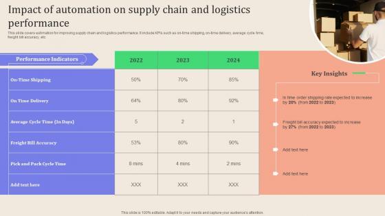 This slide covers estimation for improving supply chain and logistics performance. It include KPIs such as on time shipping, on time delivery, average cycle time, freight bill accuracy, etc. Coming up with a presentation necessitates that the majority of the effort goes into the content and the message you intend to convey. The visuals of a PowerPoint presentation can only be effective if it supplements and supports the story that is being told. Keeping this in mind our experts created Leveraging Logistics Automation Impact Of Automation On Supply Chain Topics Pdf to reduce the time that goes into designing the presentation. This way, you can concentrate on the message while our designers take care of providing you with the right template for the situation. This slide covers estimation for improving supply chain and logistics performance. It include KPIs such as on time shipping, on time delivery, average cycle time, freight bill accuracy, etc.