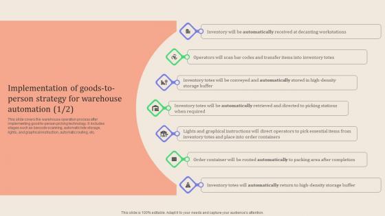This slide covers the warehouse operation process after implementing good to person picking technology. It includes stages such as barcode scanning, automatic tote storage, lights, and graphical instruction, automatic routing, etc. This Leveraging Logistics Automation Implementation Of Goods To Person Demonstration Pdf is perfect for any presentation, be it in front of clients or colleagues. It is a versatile and stylish solution for organizing your meetings. The product name features a modern design for your presentation meetings. The adjustable and customizable slides provide unlimited possibilities for acing up your presentation. Slidegeeks has done all the homework before launching the product for you. So, do not wait, grab the presentation templates today This slide covers the warehouse operation process after implementing good to person picking technology. It includes stages such as barcode scanning, automatic tote storage, lights, and graphical instruction, automatic routing, etc.
