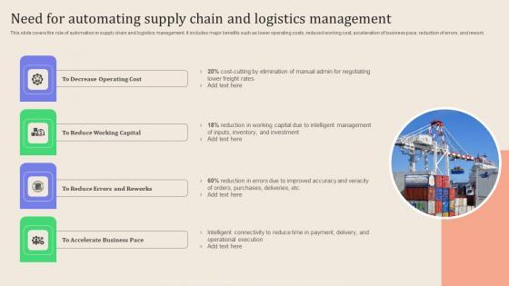 This slide covers the role of automation in supply chain and logistics management. It includes major benefits such as lower operating costs, reduced working cost, acceleration of business pace, reduction of errors, and rework. The best PPT templates are a great way to save time, energy, and resources. Slidegeeks have 100Precent editable powerpoint slides making them incredibly versatile. With these quality presentation templates, you can create a captivating and memorable presentation by combining visually appealing slides and effectively communicating your message. Download Leveraging Logistics Automation Need For Automating Supply Chain And Summary Pdf from Slidegeeks and deliver a wonderful presentation. This slide covers the role of automation in supply chain and logistics management. It includes major benefits such as lower operating costs, reduced working cost, acceleration of business pace, reduction of errors, and rework.