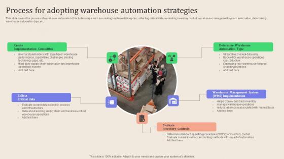This slide covers the process of warehouse automation. It includes steps such as creating implementation plan, collecting critical data, evaluating inventory control, warehouse management system automation, determining warehouse automation type, etc. Slidegeeks has constructed Leveraging Logistics Automation Process For Adopting Warehouse Automation Rules Pdf after conducting extensive research and examination. These presentation templates are constantly being generated and modified based on user preferences and critiques from editors. Here, you will find the most attractive templates for a range of purposes while taking into account ratings and remarks from users regarding the content. This is an excellent jumping off point to explore our content and will give new users an insight into our top notch PowerPoint Templates. This slide covers the process of warehouse automation. It includes steps such as creating implementation plan, collecting critical data, evaluating inventory control, warehouse management system automation, determining warehouse automation type, etc.