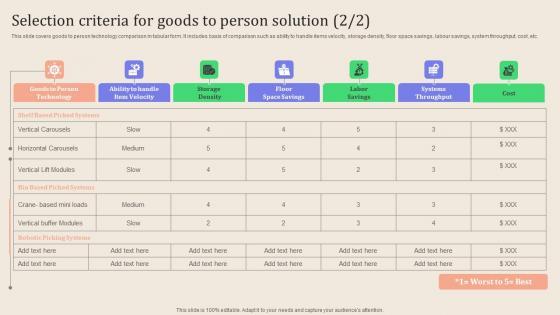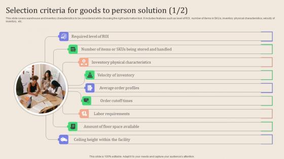 This slide covers warehouse and inventory characteristics to be considered while choosing the right automation tool. It includes features such as level of ROI, number of items in SKUs, inventory physical characteristics, velocity of inventory, etc. Take your projects to the next level with our ultimate collection of Leveraging Logistics Automation Selection Criteria For Goods To Person Solution Designs Pdf. Slidegeeks has designed a range of layouts that are perfect for representing task or activity duration, keeping track of all your deadlines at a glance. Tailor these designs to your exact needs and give them a truly corporate look with your own brand colors they all make your projects stand out from the rest. This slide covers warehouse and inventory characteristics to be considered while choosing the right automation tool. It includes features such as level of ROI, number of items in SKUs, inventory physical characteristics, velocity of inventory, etc.