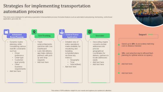 This slide covers strategies for optimizing organizations transportation process. It includes features such as automated route planning, live tracking, control tower application, geocoder, etc. Find a pre designed and impeccable Leveraging Logistics Automation Strategies For Implementing Transportation Brochure Pdf. The templates can ace your presentation without additional effort. You can download these easy to edit presentation templates to make your presentation stand out from others. So, what are you waiting for Download the template from Slidegeeks today and give a unique touch to your presentation. This slide covers strategies for optimizing organizations transportation process. It includes features such as automated route planning, live tracking, control tower application, geocoder, etc.