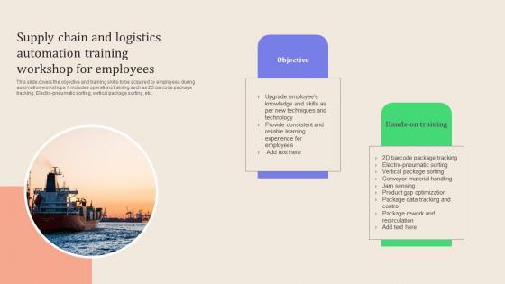 This slide covers the objective and training skills to be acquired by employees during automation workshops. It includes operations training such as 2D barcode package tracking, Electro pneumatic sorting, vertical package sorting, etc. Create an editable Leveraging Logistics Automation Supply Chain And Logistics Automation Training Structure Pdf that communicates your idea and engages your audience. Whether you are presenting a business or an educational presentation, pre designed presentation templates help save time. Leveraging Logistics Automation Supply Chain And Logistics Automation Training Structure Pdf is highly customizable and very easy to edit, covering many different styles from creative to business presentations. Slidegeeks has creative team members who have crafted amazing templates. So, go and get them without any delay. This slide covers the objective and training skills to be acquired by employees during automation workshops. It includes operations training such as 2D barcode package tracking, Electro pneumatic sorting, vertical package sorting, etc.