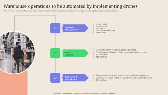 This slide covers major operational areas for drone implementation. It includes functions such as inventory management, intra logistics, inspection, and surveillance. There are so many reasons you need a Leveraging Logistics Automation Warehouse Operations To Be Automated By Download Pdf. The first reason is you can not spend time making everything from scratch, Thus, Slidegeeks has made presentation templates for you too. You can easily download these templates from our website easily. This slide covers major operational areas for drone implementation. It includes functions such as inventory management, intra logistics, inspection, and surveillance.