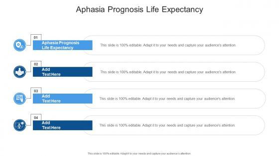 Introducing our well designed Aphasia Prognosis Life Expectancy In Powerpoint And Google Slides Cpb. This PowerPoint design presents information on topics like Aphasia Prognosis Life Expectancy. As it is predesigned it helps boost your confidence level. It also makes you a better presenter because of its high quality content and graphics. This PPT layout can be downloaded and used in different formats like PDF, PNG, and JPG. Not only this, it is available in both Standard Screen and Widescreen aspect ratios for your convenience. Therefore, click on the download button now to persuade and impress your audience. Our Aphasia Prognosis Life Expectancy In Powerpoint And Google Slides Cpb are topically designed to provide an attractive backdrop to any subject. Use them to look like a presentation pro.